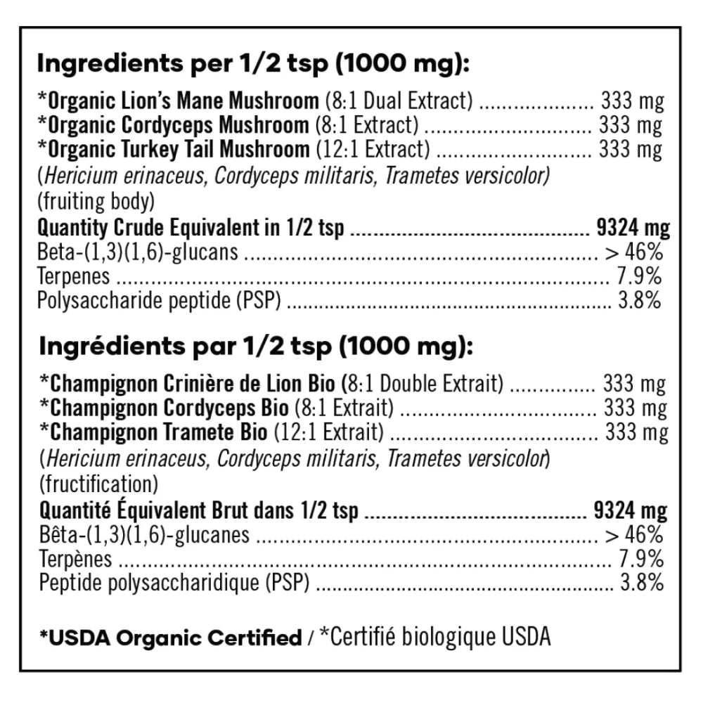 Ingrédients par 1/2 cuillère à thé (1000 mg) :Champignon queue de dinde (extrait 12:1) ...... 333mg (Trametes versicolor, corps fructifiant)Champignon Cordyceps Militaris (Extrait 8:1) ...... 333mg (Cordyceps militaris, corps fructifère)Champignon crinière de lion (extrait double 8:1) ...... 333mg (Hericium erinaceus, corps fructifère)Quantité équivalente brute dans ½ cuillère à café.........9333mgBêta-D-glucanes : > 32%Terpènes : > 5%Peptide Polysaccharide : (PSP) : > 2%*Certifié biologique par l'USDA