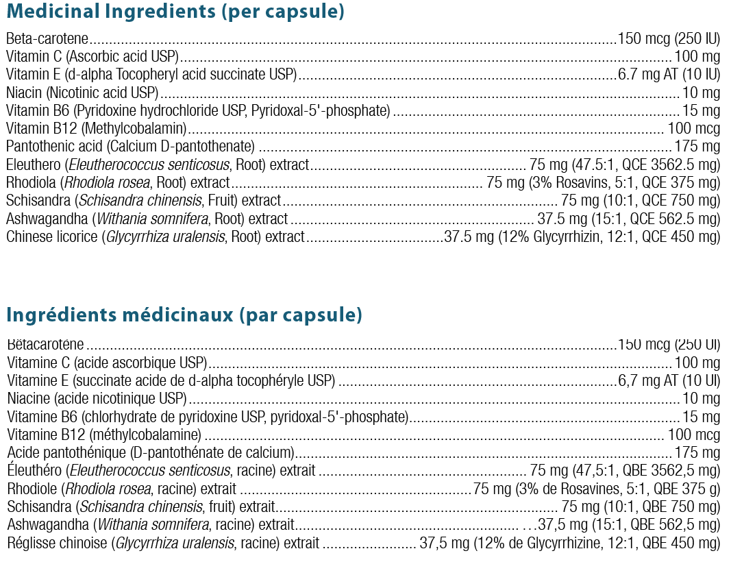 Bêta-carotène ...... 150 mcg (250 UI)Vitamine C (acide ascorbique USP) ...... 100 mgVitamine E (succinate d'acide d-alpha tocophéryl USP) ...... 6,7 mg AT (10 UI)Niacine (acide nicotinique USP) ...... 10 mgVitamine B6 (chlorhydrate de pyridoxine USP, pyridoxal-5'-phosphate) ...... 15 mgVitamine B12 (Méthylcobalamine) ...... 100 mcgAcide pantothénique (D-pantothénate de calcium) ...... 175 mgExtrait d'éleuthérocoque (Eleutherococcus senticosus, racine) ...... 75 mg (47.5:1, QCE 3562.5 mg)Rhodiola (Rhodiola rosea, Racine) extrait ...... 75 mg (3% Rosavins, 5:1, QCE 375 mg)Schisandra (Schisandra chinensis, Fruit) extrait ...... 75 mg (10:1, QCE 750 mg)Extrait d'ashwagandha (Withania somnifera, racine) ...... 37,5 mg (15:1, QCE 562.5 mg)Extrait de réglisse chinoise (Glycyrrhiza uralensis, racine) ...... 37,5 mg (12% Glycyrrhizin, 12:1, QCE 450 mg)