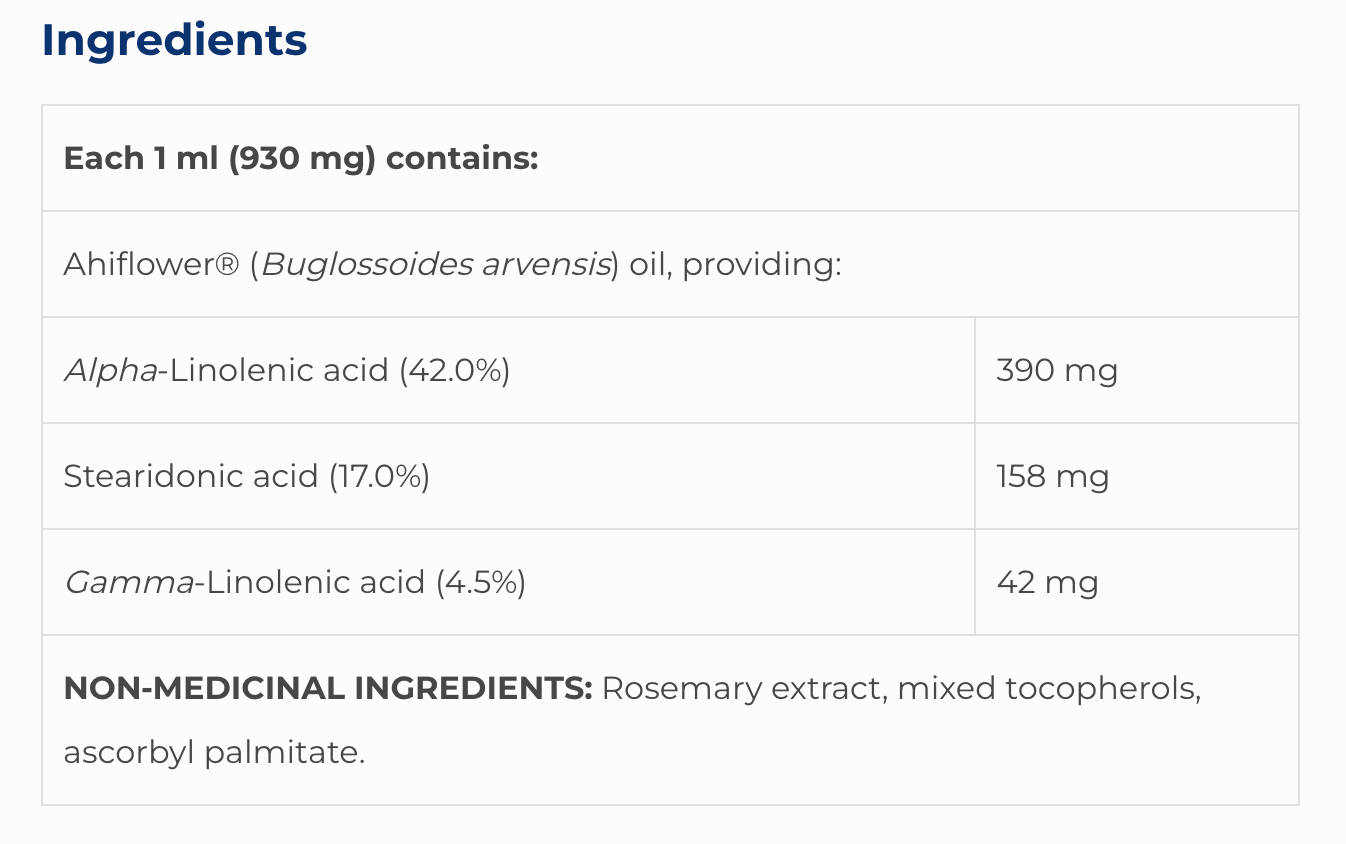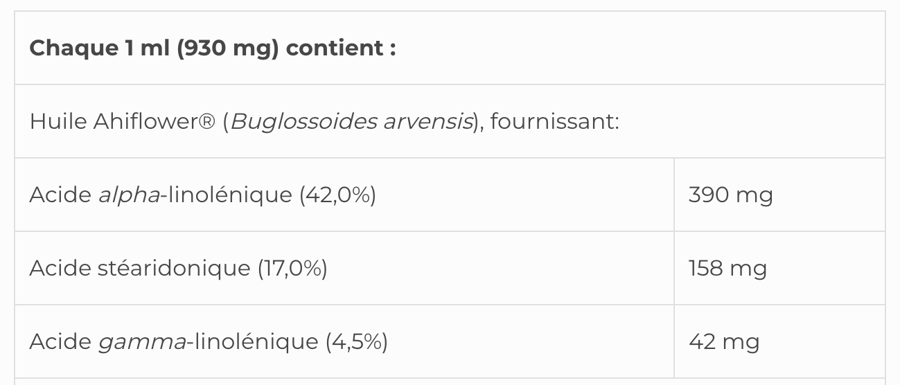 Ingrédients médicinaux (par 1 ml / 930 mg):Huile d'Ahiflower® (Buglossoides arvensis), fournissant :- Acide alpha-linolénique (42,0 %) ...... 390 mg- Acide stéaridonique (17,0 %) ...... 158 mg- Acide gamma-linolénique (4,5 %) ...... 42 mg
