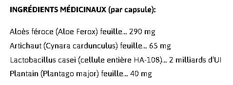 Aloès féroce (Aloe Ferox) feuille… 290 mgArtichaut (Cynara cardunculus) feuille… 65 mgLactobacillus casei (cellule entière HA-108)… 2 milliards d’UIPlantain (Plantago major) feuille… 40 mg