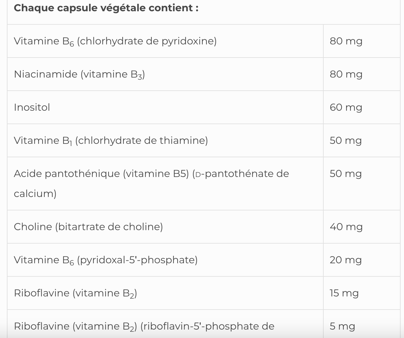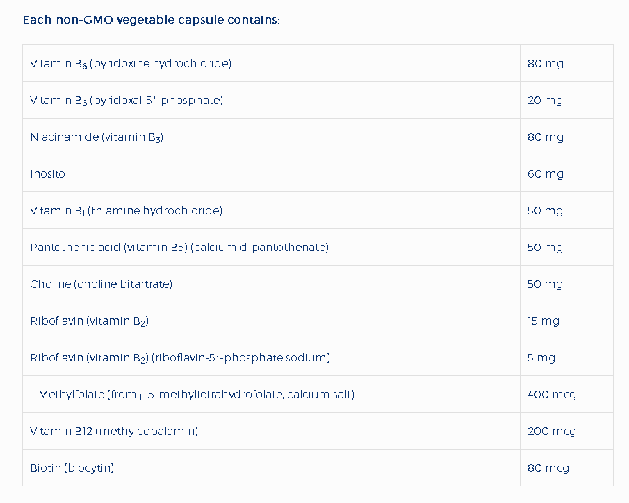Ingrédients médicinaux (par capsule):Vitamine B6 (chlorhydrate de pyridoxine) ...... 80 mgNiacinamide (vitamine B3) ...... 80 mgInositol ...... 60 mgVitamine B1 (chlorhydrate de thiamine) ...... 50 mgAcide pantothénique (vitamine B5) (d-pantothénate de calcium) ...... 50 mgCholine (bitartrate de choline) ...... 40 mgVitamine B6 (pyridoxal-5ʹ-phosphate) ...... 20 mgRiboflavine (vitamine B2) ...... 15 mgRiboflavine (vitamine B2) (riboflavine-5ʹ-phosphate de sodium) ...... 5 mgl-Méthylfolate (de l-5-méthyltétrahydrofolate, sel de calcium) ...... 400 mcgVitamine B12 (méthylcobalamine) ...... 200 mcgBiotine ...... 80 mcg