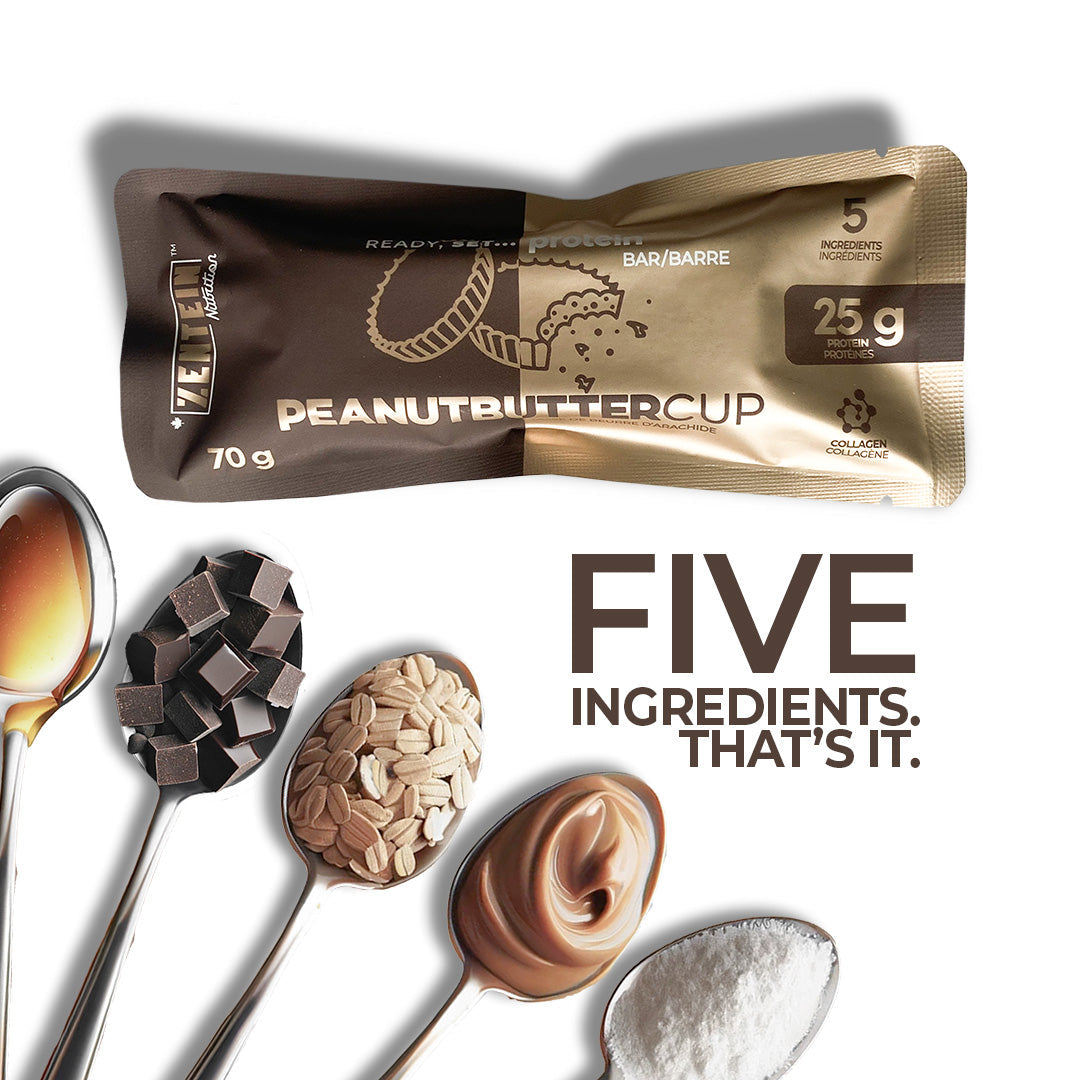 Avec nos barres protéinées Zentein, vous disposez toujours d'une source pratique de nutrition que vous pouvez choisir en toute confiance. Elles sont composées de seulement 5 ingrédients et ne contiennent pas d'édulcorants artificiels, de sirops de fibres, de conservateurs artificiels, de colorants artificiels, d'huiles hydrogénées ou de concentré de protéines de soja.