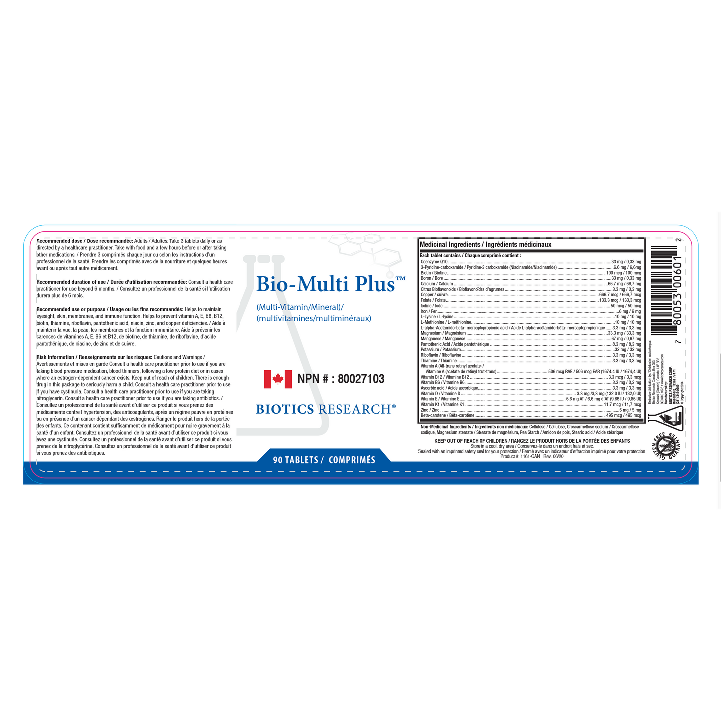 - Bio-Multi PlusTM est un supplément polyvalent et équilibré de vitamines et de minéraux multiples, qui fournit des formes uniques de micronutriments importants disponibles exclusivement auprès de Biotics Research Corporation. Trois options sont disponibles pour cette multivitamine : Bio-Multi Plus contenant à la fois du fer et du cuivre, Bio-Multi Plus sans fer et Bio-Multi Plus sans fer et cuivre.