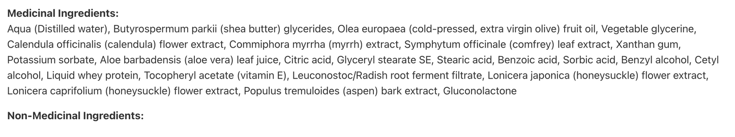 Ingrédients médicinaux :Aqua (eau distillée), glycérides de Butyrospermum parkii (beurre de karité), huile de fruit d’Olea europaea (huile d’olive extra vierge pressée à froid), glycérine végétale, extrait de fleur de Calendula officinalis (souci), extrait de Commiphora myrrha (myrrhe), extrait de feuille de Symphytum officinale (consoude), gomme de xanthane, sorbate de potassium, jus de feuilles d’Aloe barbadensis (aloe vera), acide citrique, stéarate de glycéryle SE, acide stéarique, acide benzoïque, acide sorbique, alcool benzylique, alcool cétylique, protéine de petit-lait liquide, acétate de tocophéryle (vitamine E), filtrat de fermentation de racine de leuconostoque/radis, extrait de fleur de Lonicera japonica (chèvrefeuille), extrait de fleur de Lonicera caprifolium (chèvrefeuille), extrait d’écorce de Populus tremuloides (tremble), gluconolactone