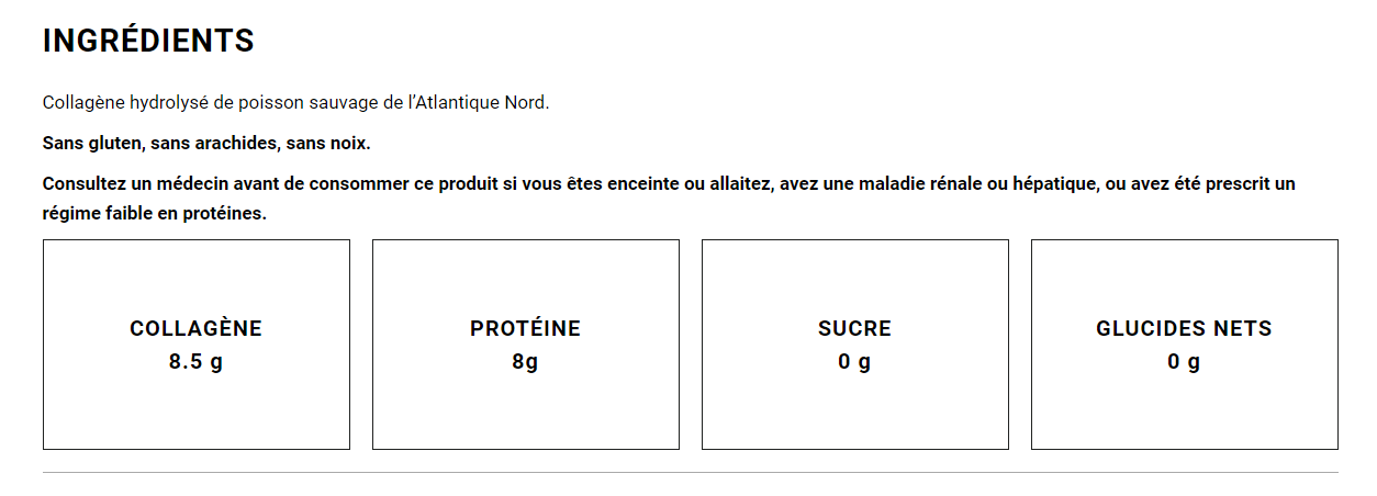 Ajoutez ce collagène super pure et fabriqué au Canada à vos lattes, cafés, yogourts ou à n’importe quel aliment de votre choix. Ce collagène provient de la Nouvelle-Écosse, fabriqué de manière durable à partir de poisson sauvage de l'Atlantique Nord. L'ajout de collagène hydrolysé à votre routine peut offrir une panoplie de bienfaits pour la santé des articulations, de la peau et plus encore. Absolument aucun goût ou odeur de poisson! ARTICULATIONS - Plusieurs études ont démontré que l'hydrolysat de collagène a un effet protecteur sur les articulations et améliore la régénération du cartilage, aidant à soulager les douleurs et les raideurs articulaires. PEAU - De nombreuses recherches ont prouvé l’effet bénéfique du collagène sur la peau, notamment l’amélioration de l’hydratation, du tonus, et de l’élasticité. Dans une étude, il a également été démontré que le collagène avait un impact positif sur les zones touchées par la cellulite. CHEVEUX - De nombreux clients de Landish constatent que leurs cheveux sont plus hydratés, plus forts et moins cassants après une consommation régulière de notre collagène marin. Ceci serait attribuable aux acides aminés du collagène qui peuvent aider à améliorer la santé des follicules et soutenir les protéines structurelles des cheveux. ONGLES - Un très grand nombre de clients ont signalé des ongles plus forts qui poussent plus vite après plusieurs semaines de consommation quotidienne de notre collagène marin. Cela serait dû à une consommation accrue d'acides aminés nécessaires à la production de kératine, le bloc de construction structurel des ongles. OS - Les os sont principalement constitués de collagène, ce qui leur fournit structure et soutien. Plusieurs études ont démontré qu'une consommation régulière d’hydrolysat de collagène peut avoir une influence positive sur la composition des os, leur résistance et leur densité. MUSCLES - Quelques études cliniques ont démontré que la consommation quotidienne de collagène hydrolysé favorise la croissance, la force et la réparation des muscles, lorsqu'elle est combinée à un entraînement de résistance. CŒUR - Une étude portant sur 31 participants a montré que la consommation quotidienne de collagène contribuerait à réduire la rigidité artérielle, un facteur important pour maintenir une bonne santé cardiaque.