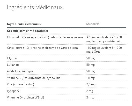 Palmier nain (Serenoa repens) extrait de baies 4:1 ...... 320 mg équivalent à 1 280 mg de palmier nainOrtie (Urtica dioica) 10:1 extrait de racine et de rhizome ...... 100 mg équivalent à 1.000 mg d'ortieGlycine ...... 50 mgL- Alanine ...... 50 mgL-acide glutamique ...... 50 mgVitamine B6 (pyridoxine HCI) ...... 10 mgZinc (citrate de zinc) ...... 7,5 mgLycopène ...... 2 mgVitamine D (cholécalciférol) ...... 5 mcg