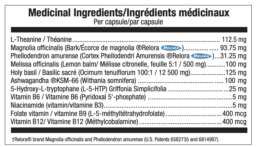Ingrédients médicinaux (par capsule):L-Theanine ...... 112.5 mgMagnolia officinalis (Écorce de magnolia ®Relora ) ...... 93.75 mgPhellodendron amurense (Cortex Phellodendri Amurensis ®Relora ) ...... 31.25 mgMelissa officinalis (Mélisse, feuille 5:1 / 500 mg) ...... 100 mgBasilic sacré (Ocimum tenuiflorum 100:1 / 12 500 mg) ...... 125 mgAshwagandha ®KSM-66 (Withania somnifera) ...... 100 mg5-Hydroxy-L-tryptophane (L-5-HTP) Griffonia Simplicifolia ...... 25 mgVitamine B6 (Pyridoxal 5'-phosphate) ...... 5 mgNiacinamide (vitamine B3) ...... 5 mgFolate vitamine B9 (L-5-méthyltétrahydrofolate) ...... 400 mcgVitamine B12 (Méthylcobalamine) ...... 400 mcg
