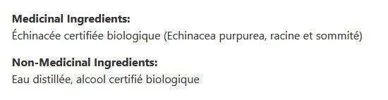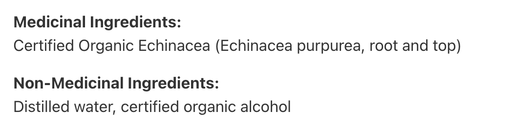 Ingrédients médicinaux :Échinacée certifiée biologique (Echinacea purpurea, racine et sommité)