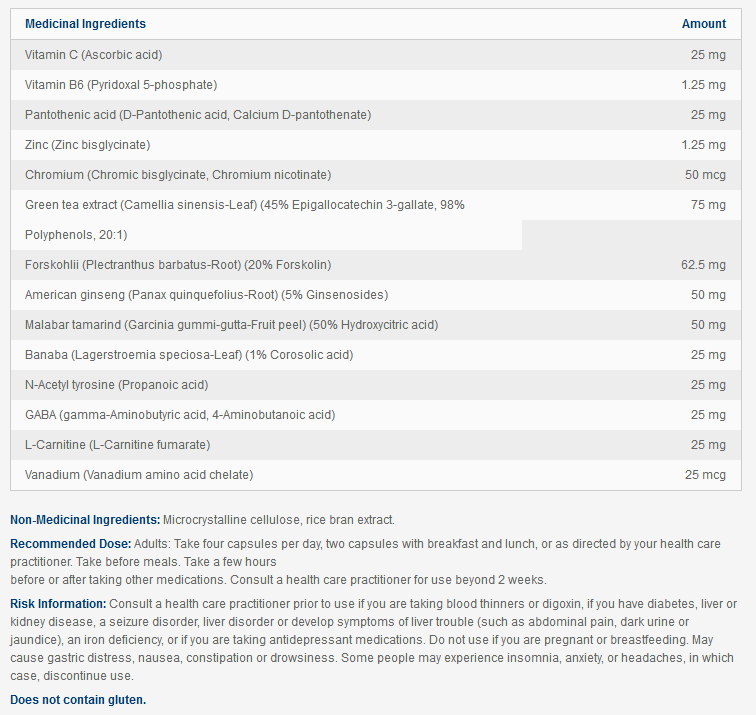 Ingrédients médicinaux (par capsule) :Extrait de thé vert (Camellia sinensis-Leaf) (45% Epigallocatechin 3-gallate, 98% Polyphenols, 20:1)................... 75 mgForskohlii (Plectranthus barbatus-Racine) (20% Forskoline) .............................62.5 mgGinseng américain (Panax quinquefolius-Root) (5% Ginsenosides).....................................50 mgTamarin de Malabar (Garcinia gummi-gutta - écorce de fruit) (50% d'acide hydroxycitrique)...........................50 mgBanaba (Lagerstroemia speciosa-Feuilles) (1% Acide corosolique)...................... 25 mgGABA (acide gamma-aminobutyrique, acide 4-aminobutanoïque)................... 25 mgL-Carnitine (L-Carnitine fumarate).................................. 25 mgN-acétyl tyrosine (acide propanoïque).......................................... 25 mgAcide pantothénique (acide D-pantothénique, D-pantothénate de calcium) ...................................................... 25 mgVitamine C (acide ascorbique) .................................... 25 mgVitamine B6 (Pyridoxal 5-phosphate).................................1.25 mgZinc (bisglycinate de zinc)....................1.25 mgChrome (bisglycinate de chrome, nicotinate de chrome).................. 50 mcgVanadium (chélate d'acide aminé de vanadium) ..............................25 mcg
