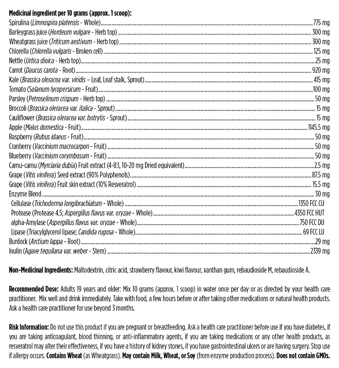 Les ingrédients ont été soigneusement cultivés, récoltés à leur pic de puissance et protégés des facteurs de stress environnementaux afin de préserver les phytonutriments bénéfiques. Il se mélange facilement aux boissons et est fabriqué sans agents de remplissage, agents de gonflement, céréales, légumineuses, luzerne, gluten, sucre ajouté ou édulcorants artificiels. Chaque cuillère de superaliments densément concentrés soutient le statut antioxydant, la santé digestive et le bien-être général.