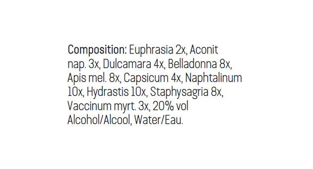 Ingrédients : Euphrasia officinalis 2x, Aconit Nap. 3x, Dulcamara 4x, Belladonna 8x, Apis Mel. 8x, Capsicum annuum 4x, Naphtalinum 10x, Hydrastis Canadensis 10x, Staphysagria 8x, Vaccinum myrtillus 3x, Alcool à 20% vol, Eau.