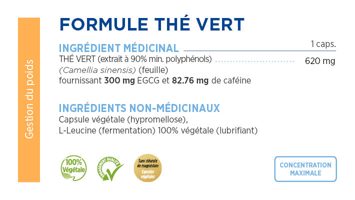 Ingrédients médicinaux (par capsule): EXTRAIT DE THÉ VERT (Camellia sinensis) (extrait 90% min.polyphénols) (feuille) fournissant 300 mg EGCG et 82.76 mg de caféine ...... 620 mg