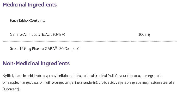 Ingrédients médicinaux : Acide gamma-aminobutyrique (GABA) 100 mg(du complexe Pharma GABATM 80 de 129 mg)