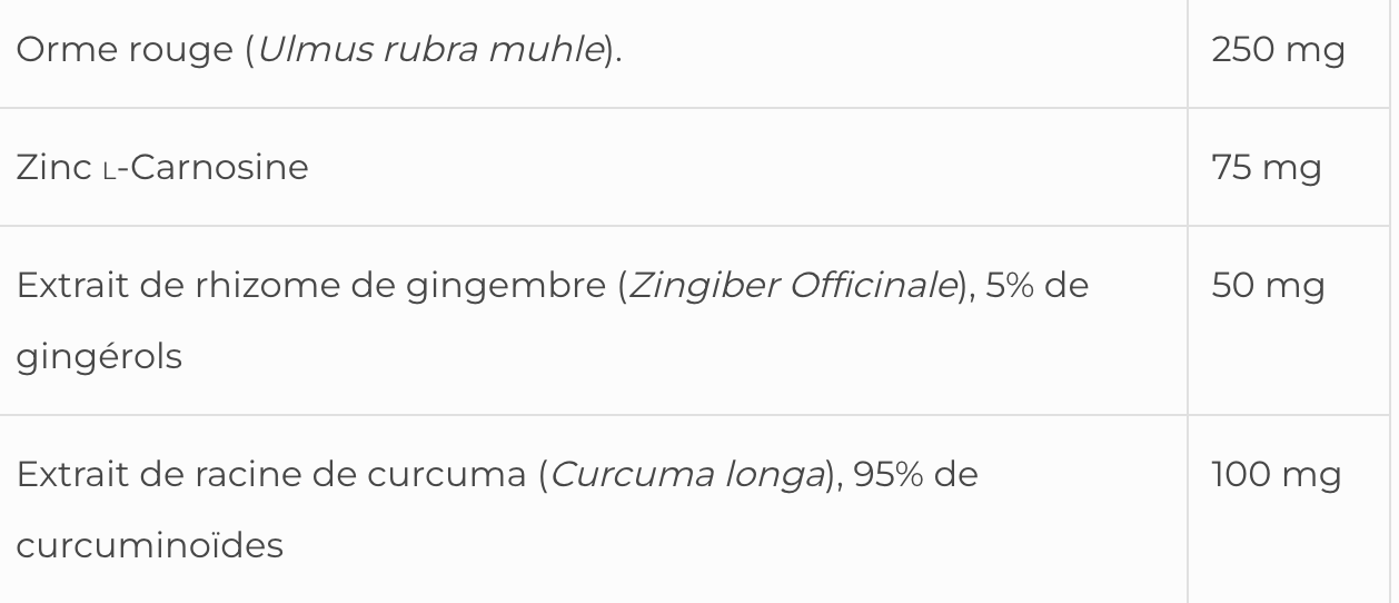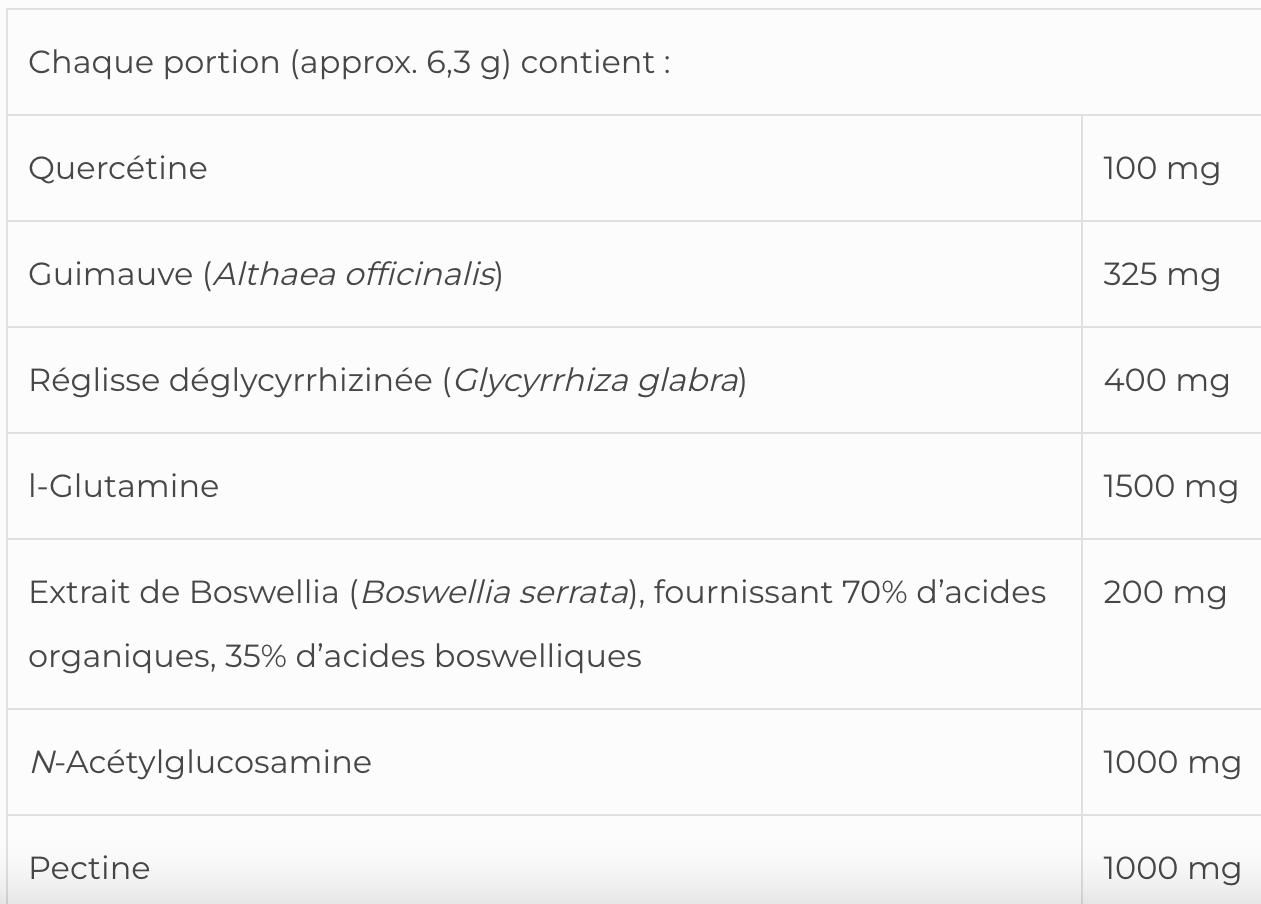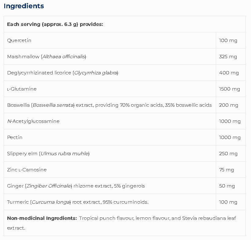 Ingrédients médicinaux (par portion de 6,3 g):Quercétine ...... 100 mgGuimauve (Althaea officinalis) ...... 325 mgRéglisse déglycyrrhizinée (Glycyrrhiza glabra) ...... 400 mgL-Glutamine ...... 1500 mgExtrait de Boswellia (Boswellia serrata), apportant 70 % d'acides organiques, 35 % d'acides boswelliques ...... 200 mgN-acétylglucosamine ...... 1000 mgPectine ...... 1000 mgOrme rouge (Ulmus rubra muhle) ...... 250 mgZinc L-Carnosine ...... 75 mgExtrait de rhizome de gingembre (Zingiber Officinale), 5% gingérols ...... 50 mgExtrait de racine de curcuma (Curcuma longa), 95% curcuminoïdes ...... 100 mg