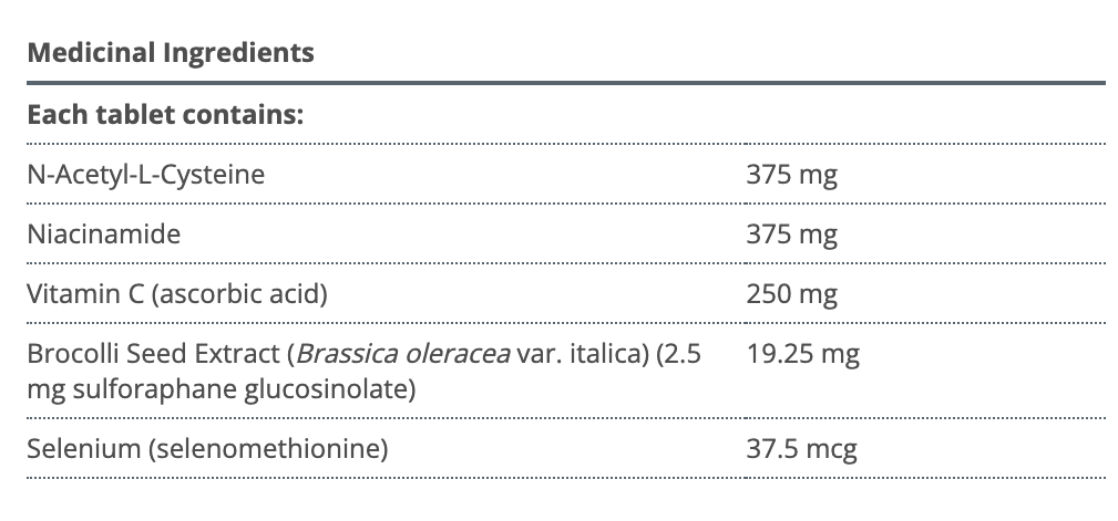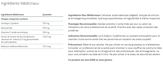 N-acétyl-L-cystéine ...... 375 mgNiacinamide ...... 375 mgVitamine C (acide ascorbique) ...... 250 mgExtrait de graines de Brocolli (Brassica oleracea var. italica) (2,5 mg sulforaphane glucosinolate) ...... 19,25 mgSélénium (sélénométhionine) ...... 37,5 mcg