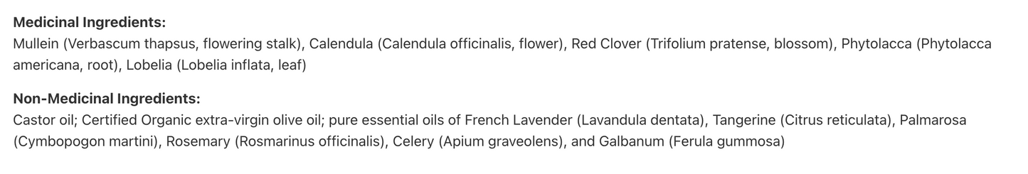 Ingrédients médicinaux:Molène (Verbascum thapsus, tige en fleurs), souci (Calendula officinalis, fleur), trèfle rouge (Trifolium pratense, fleur), phytolaque d’Amérique (Phytolacca americana, racine), lobélie (Lobelia inflata, feuille)