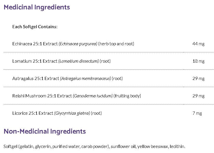 Ingrédients médicinaux gélules: Echinacea 25:1 Extract (Echinacea purpurea) (plante supérieure et racine) 44 mgLomatium 25:1 Extrait (Lomatium dissectum) (racine) 18 mgAstragalus 25:1 Extrait (Astragalus membranaceus) (racine) 29 mgExtrait 25:1 de champignon Reishi (Ganoderma lucidum) (organe de fructification) 29 mgExtrait de réglisse 25:1 (Glycyrrhiza glabra) (racine) 7 mg