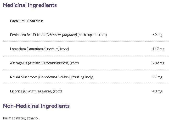 Ingrédients médicinaux teinture : Extrait d'Echinacea 8:1 (Echinacea purpurea) (partie supérieure et racine de l'herbe) 69 mgLomatium (Lomatium dissectum) (racine) 117 mgAstragale (Astragalus membranaceus) (racine) 232 mgChampignon Reishi (Ganoderma lucidum) (organe de fructification) 97 mgRéglisse (Glycyrrhiza glabra) (racine) 40 mg