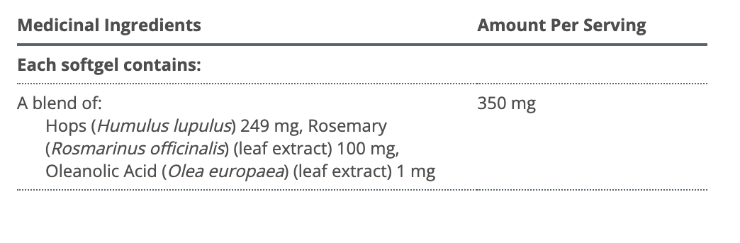 Un mélange de :Houblon (Humulus lupulus) 249 mg, Romarin (Rosmarinus officinalis) (extrait de feuille) 100 mg, Acide oléanolique (Olea europaea) (extrait de feuille) 1 mg ...... 350 mg