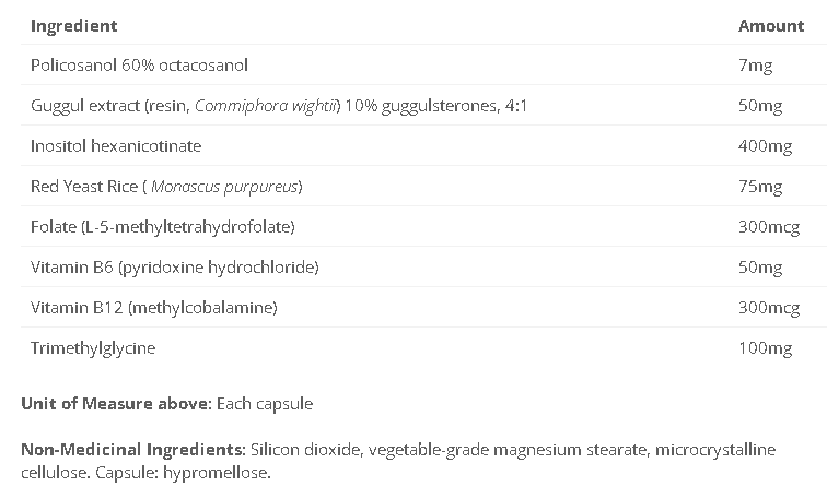 Ingrédient (par capsule):Policosanol 60% octacosanol 7mgExtrait de résine de guggul (Commiphora wightii) 3:1 50mgInositol hexanicotinate 400 mgLevure de riz rouge (Monascus purpureus) 75 mgFolate (L-5-méthyltétrahydrofolate) 300mcgVitamine B6 (chlorhydrate de pyridoxine) 50 mgVitamine B12 (méthylcobalamine) 300mcgTriméthylglycine 100 mg