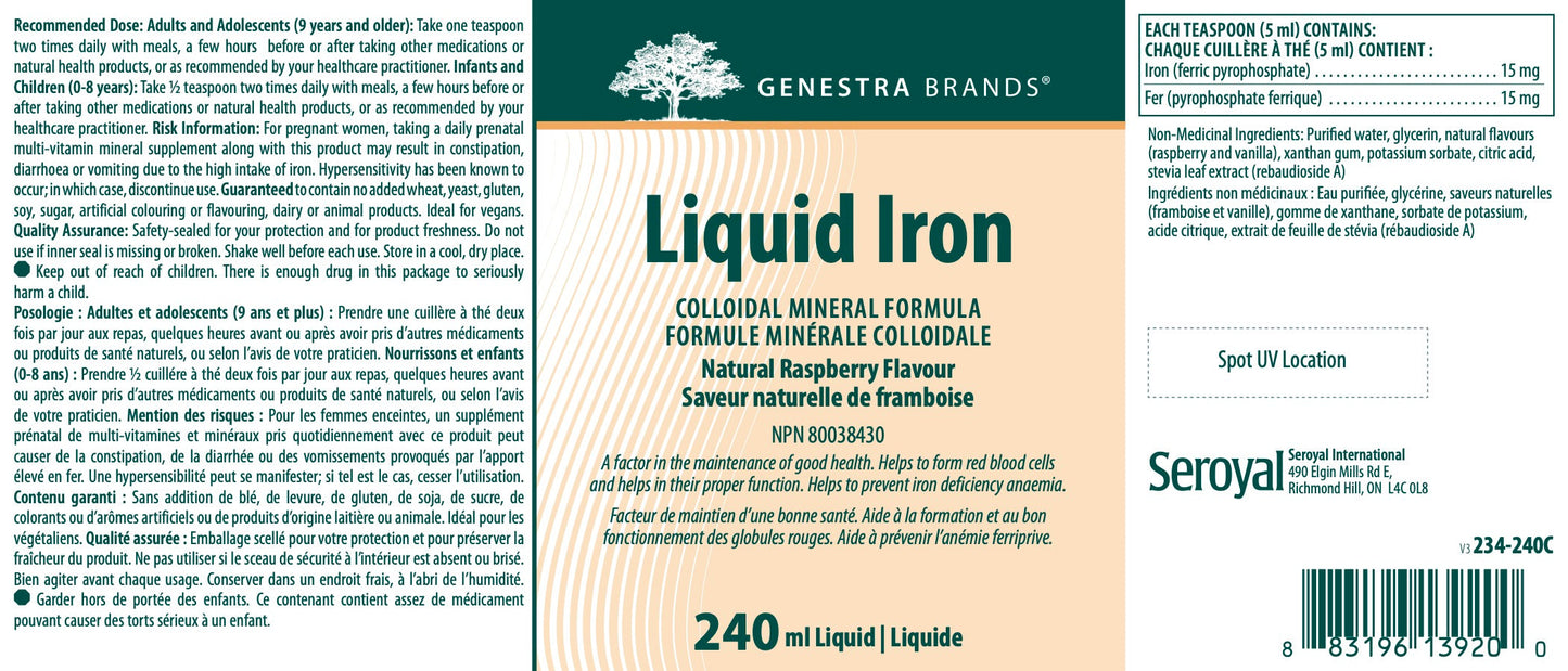 L’insuffisance de l’apport de fer est une des carences nutritionnelles les plus communes, qui affectent quelque 2 milliards de personnes dans le monde, les femmes et les enfants étant considérés les groupes les plus à risque. Chaque portion d’une demi-cuillère de Liquid Iron fournit 15 mg de fer sous forme de pyrophosphate ferrique microencapsulé, forme de fer hautement biodisponible et bien tolérée. La supplémentation quotidienne au moyen de 18 mg de pyrophosphate ferrique microencapsulé a amélioré le bilan en fer, lors d’un essai clinique auquel participaient 122 femmes préménopausées, en 4 semaines.