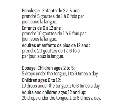 Adultes : 20 gouttes sous la langue, 1 à 6 fois par jour.