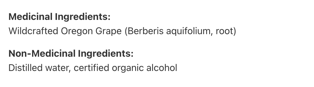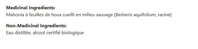 Ingrédients médicinaux:Mahonia à feuilles de houx cueilli en milieu sauvage (Berberis aquifolium, racine)
