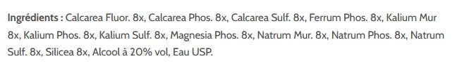 Ingrédients : Calcarea Fluor. 8x, Calcarea Phos. 8x, Calcarea Sulf. 8x, Ferrum Phos. 8x, Kalium Mur 8x, Kalium Phos. 8x, Kalium Sulf. 8x, Magnesia Phos. 8x, Natrum Mur. 8x, Natrum Phos. 8x, Natrum Sulf. 8x, Silicea 8x, Alcool à 20% vol, Eau USP.