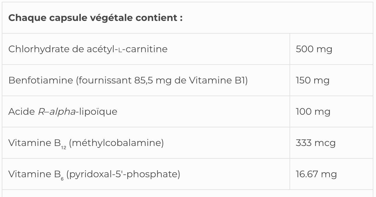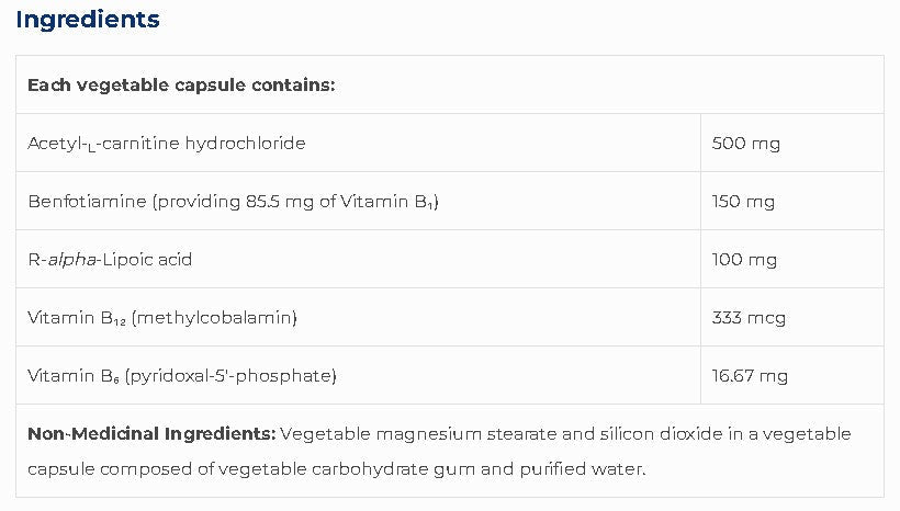 Ingrédients médicinaux (par capsule):Chlorhydrate d'acétyl-L-carnitine ...... 500 mgBenfotiamine (apportant 85,5 mg de vitamine B₁) ...... 150 mgAcide R-alpha-lipoïque ...... 100 mgVitamine B₁₂ (méthylcobalamine) ...... 333 mcgVitamine B₆ (pyridoxal-5′-phosphate) ...... 16,67 mg