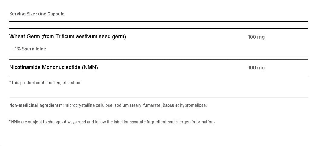 Ingrédients par capsule :Germe de blé (de Triticum aestivum seed germ) 100 mg- 1% Spermidine 1 mgNicotinamide Mononucléotide (NMN) 100 mg