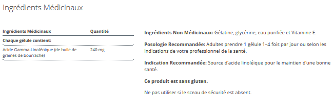 Ingrédients médicinaux (par gélule): Acide gamma-linolénique (de l'huile de graines de bourrache) ...... 240 mg