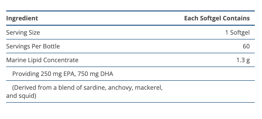 Concentré de lipides marinsApportant 250 mg d'EPA, 750 mg de DHA (dérivés d'un mélange de sardines, d'anchois, de maquereaux et de calmars) ........ 1.3 g