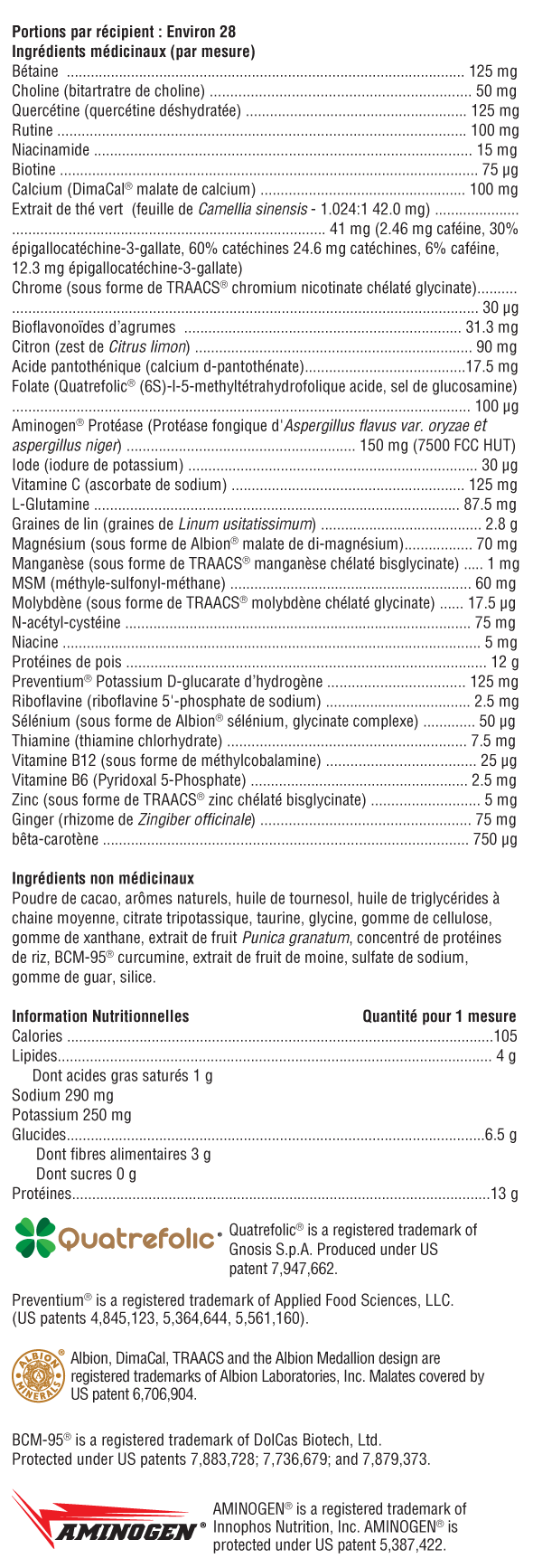 Bétaïne ...... 125 mgCholine (bitartrate de choline) ...... 50 mgQuercetine (Quercétine dihydrate) ...... 125 mgRutine ...... 100 mgNiacinamide ...... 15 mgBiotine ...... 75 mcgCalcium (malate dicalcique DimaCal®) ...... 100 mgExtrait de thé vert (Camellia sinensis, feuille - 1,024:1 42,0 mg) ............ 41 mg (2,46 mg Caféine, 30% Epigallocatéchine 3-gallate, 60% Catéchines 24,6 mg Catéchines, 6% Caféine, 12,3 mg Epigallocatéchine 3-gallate)Chrome (sous forme de chélate de nicotinate glycinate de chrome TRAACS®) ...... 30 mcgBioflavonoïdes d'agrumes ...... 31,3 mgCitron (Citrus limon, écorce de fruit) ...... 90 mgAcide pantothénique (Calcium-d-pantothénate) ...... 17,5 mgFolate (acide Quatrefolic® (6S)-5-Méthyltétrahydrofolique, sel de glucosamine) ...... 100 mcgAminogen® Protease (protéase fongique d'Aspergillus flavus var. oryzae et d'Aspergillus niger) ...... 150 mg (7500 FCC HUT)Iode (iodure de potassium) ...... 30 mcgVitamine C (Ascorbate de sodium) ...... 125 mgL-Glutamine ...... 87,5 mgGraine de lin (Linum usitatissimum, graine) ...... 2,8 gMagnésium (Albion® di-magnesium malate) ...... 70 mgManganèse (chélate de bisglycinate de manganèse TRAACS®) ...... 1 mgMSM (méthylsulfonylméthane) ...... 60 mgMolybdène (chélate de glycinate de molybdène TRAACS®) ...... 17,5 mcgN-Acétyl-L-cystéine ...... 75 mgNiacine ...... 5 mgProtéine de pois ...... 12 gPreventium® Hydrogène D-glucarate de potassium ...... 125 mgRiboflavine (Riboflavine 5'-phosphate sodique) ...... 2,5 mgSélénium (Albion® selenium glycinate complex) ...... 50 mcgThiamine (chlorhydrate de thiamine) ...... 7,5 mgVitamine B12 (méthylcobalamine) ...... 25 mcgVitamine B6 (Pyridoxal 5-phosphate) ...... 2,5 mgZinc (chélate de bisglycinate de zinc TRAACS®) ...... 5 mgGingembre (Zingiber officinale, rhizome) ...... 75 mgbeta-Carotène ...... 750 mcg