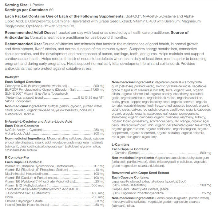 Ingrédients médicinaux : BioPQQ® (en anglais)Chaque softgel contientCoenzyme Q10 (micro-organisme) (cellule entière) 200 mgBioPQQ® Pyrroloquinoline Quinone (sel disodique) 17,65 mgSUN-E 900™ Vitamine E (d-Alpha Tocophérol) (Helianthus annuus) (graine) 5 UI (3,35 mg AT*)*Alpha TocophérolN-acétyl-L-cystéine et acide alpha-lipoïqueChaque comprimé contientNAC (N-acétyl-L-cystéine) 250 mgAcide alpha-lipoïque 300 mgComplexe B-ProChaque gélule contientVitamine B1 (Chlorhydrate de Thiamine, Benfotiamine) 31.7 mgVitamine B2 (Riboflavine 5'-Phosphate de sodium) 10 mgNiacine (hexanicotinate d'inositol) 100 mgVitamine B5 (Calcium d-Pantothénate) 100 mgVitamine B6 (Pyridoxal 5'-Phosphate Monohydrate) 25 mgVitamine B12 (méthylcobalamine) 500 mcgFolate (de l'acide (6S)-5-méthyltétrahydrofolique (MTHF), sel de glucosamine, Quatrefolic®) 400 mcgBiotine 250 mcgCitrate de dihydrogène de choline 50 mgInositol (hexanicotinate d'inositol) 50 mgL-CarnitineChaque gélule contientL-Carnitine (Tartrate) 500 mgResvératrol avec extrait de pépins de raisinChaque gélule contient :Extrait de Renouée du Japon (Fallopia japonica) (racine) (20% Trans-Resveratrol) 200 mgExtrait de pépins de raisin (Vitis vinifera) (pépins) (80 % de proanthocyanidines oligomériques) 25 mgVitamine E 400 avec séléniumChaque comprimé contientVitamine E (succinate d'acide d-alpha-tocophéryl) 400 UI (268 mg AT*)Sélénium (levure) 100 mcgVitamine C (acide ascorbique) 100 mgManganèse (Gluconate) 10 mg*Alpha Tocophérol
