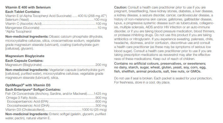 L-Carnitine Capsule végétale (gomme glucidique [cellulose], eau purifiée), silice, cellulose microcristalline, stéarate de magnésium de qualité végétale (lubrifiant).Resvératrol avec extrait de pépins de raisin Capsule de gélatine (gélatine, eau purifiée), cellulose microcristalline, stéarate de magnésium de qualité végétale (lubrifiant), silice.Vitamine E 400 avec séléniumPhosphate de calcium dibasique dihydraté, cellulose microcristalline, silice, croscarmellose sodique, stéarate de magnésium de qualité végétale (lubrifiant), enrobage (gomme glucidique [cellulose], glycérine).Bisglycinate de magnésium Gélule végétale (gomme glucidique [cellulose], eau purifiée), cellulose microcristalline, stéarate de magnésium de qualité végétale (lubrifiant), silice. OptiMega3® avec vitamine D3 Softgel entérique (gélatine, glycérine, eau purifiée, pectine), vitamine E naturelle.