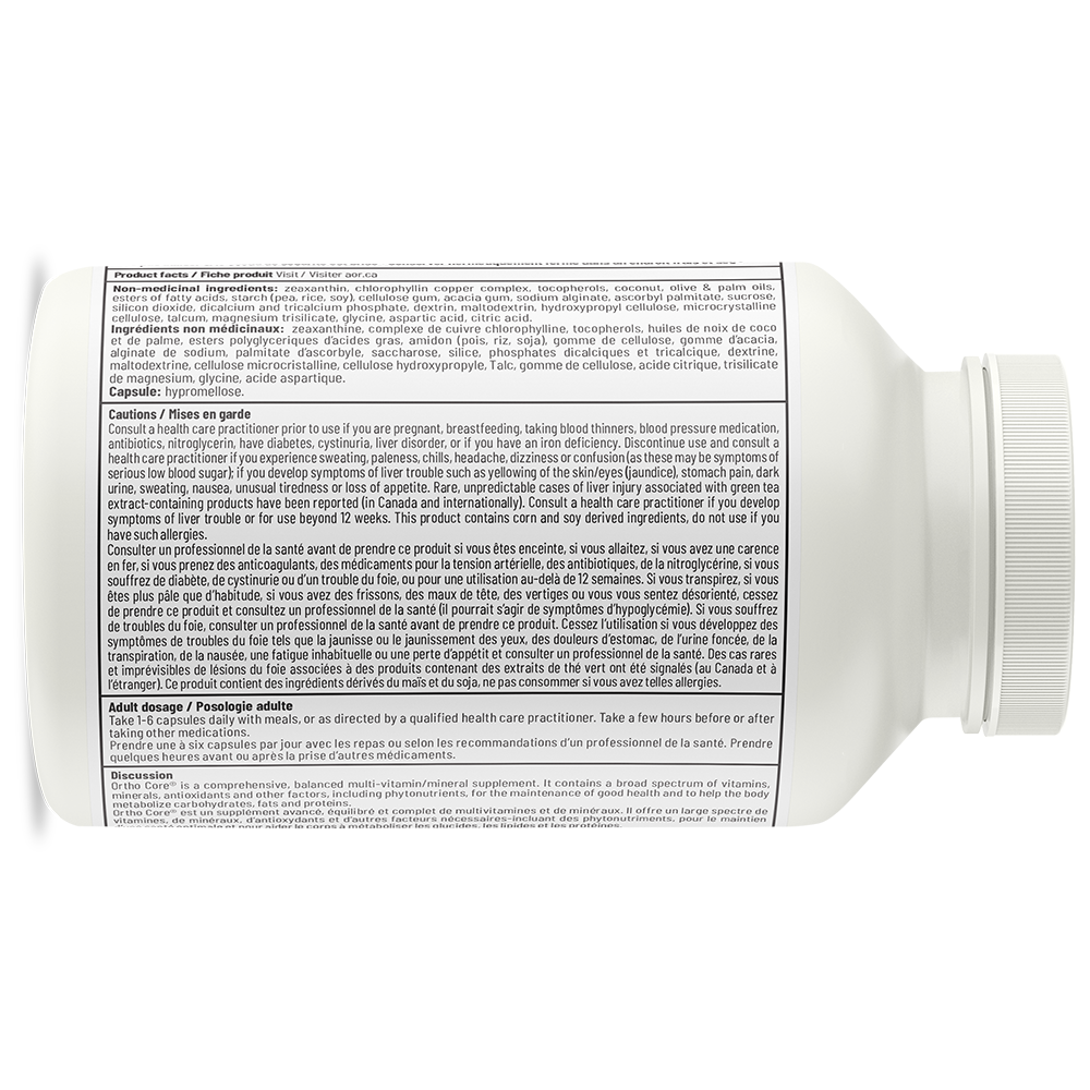 Ortho Core est soigneusement formulé pour fournir des ratios équilibrés, des doses sûres et efficaces ainsi que les formes de nutriments les plus biodisponibles, tous soutenus par la recherche. Cette formule est ensuite enrichie de certains des antioxydants et phytonutriments les plus importants et les plus actifs sur le plan biologique afin de faire d’Ortho Core d’AOR un supplément unique capable de répondre à tous vos besoins pour le maintien d’une bonne santé.