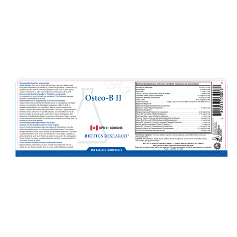 - Osteo-B IITM, comme Osteo-B Plus®, est une formule complète de soutien osseux. L'os est un tissu dynamique qui nécessite une nutrition adéquate pour le maintien et la croissance. Un apport adéquat en calcium et en vitamine D tout au long de la vie est lié à la réduction du risque d'ostéoporose grâce au mécanisme d'optimisation de la masse osseuse maximale à l'adolescence et au début de l'âge adulte, ou de ralentissement du taux de perte osseuse chez les personnes ayant des antécédents familiaux de la maladie, les femmes ménopausées et les hommes et les femmes âgés. Bien que le calcium soit un composant important pour soutenir la santé des os, d'autres synergistes nutritionnels sont tout aussi importants pour soutenir et nourrir le système squelettique. Osteo-B II fournit des synergistes nutritionnels clés, y compris le calcium et le magnésium, dans un rapport de 1:1. Osteo-B IITM est similaire au produit Osteo-B Plus, cependant, Osteo-B II est un comprimé plus petit qui ne contient pas de cuivre, utilise des formes phosphorylées de vitamines B et, comme indiqué ci-dessus, fournit du calcium et du magnésium dans un rapport de 1:1.