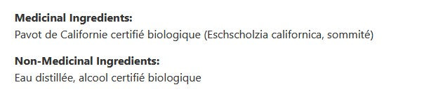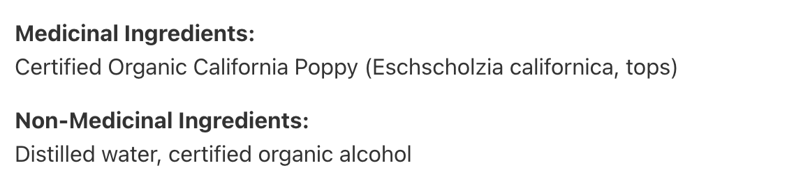 Ingrédients médicinaux :Pavot de Californie certifié biologique (Eschscholzia californica, sommité)