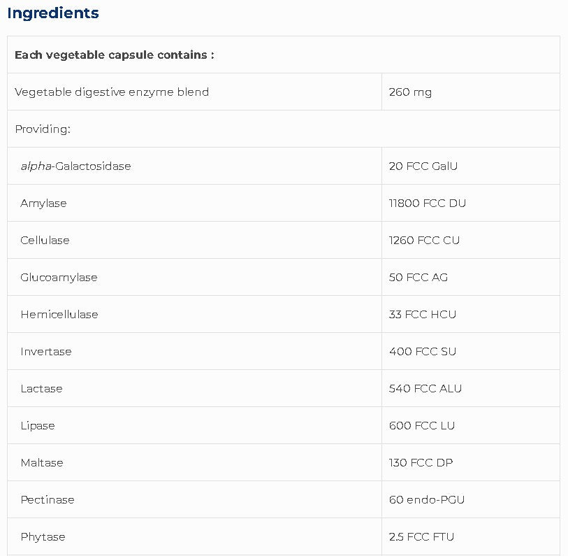 Ingrédients médicinaux (par capsule) :Mélange d'enzymes digestives végétales ............ 260 mgFournissant :- alpha-Galactosidase ...... 20 FCC GalU- Amylase ...... 11800 FCC DU- Cellulase ...... 1260 FCC CU- Glucoamylase ...... 50 FCC AG- Hémicellulase ...... 33 FCC HCU- Invertase ...... 400 FCC SU- Lactase ...... 540 FCC ALU- Lipase ...... 600 FCC LU- Maltase ...... 130 FCC DP- Pectinase ...... 60 endo-PGU- Phytase ...... 2,5 FCC FTU- Protéase fongique (protéase) ...... 40 000 FCC HUT- Protéase fongique (protéase acide) ...... 50 FCC SAP- Protéase bactérienne (protéase neutre) ...... 4500 FCC PC- Dipeptidyl-peptidase IV ...... 2050 FCC HUT- Xylanase ...... 300 XU- Bromélaïne (tige d'Ananas comosus) 2400 GDU/g ...... 50 mg- Papaïne (Carica papaya) 2400000 FCC PU ...... 40 mg