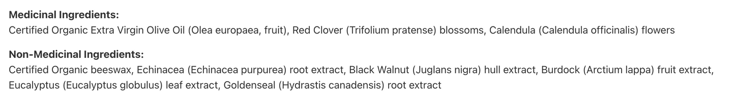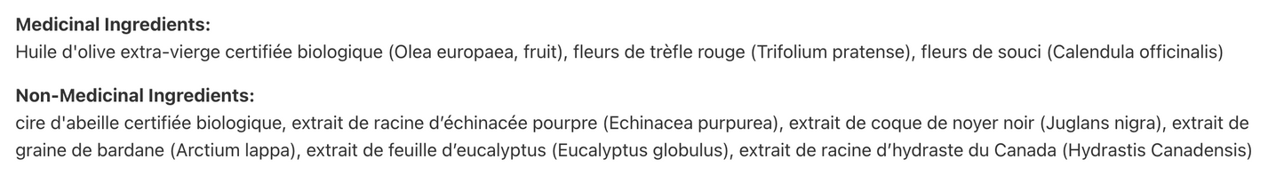 Ingrédients non-médicinaux:cire d'abeille certifiée biologique, extrait de racine d’échinacée pourpre (Echinacea purpurea), extrait de coque de noyer noir (Juglans nigra), extrait de graine de bardane (Arctium lappa), extrait de feuille d’eucalyptus (Eucalyptus globulus), extrait de racine d’hydraste du Canada (Hydrastis Canadensis)