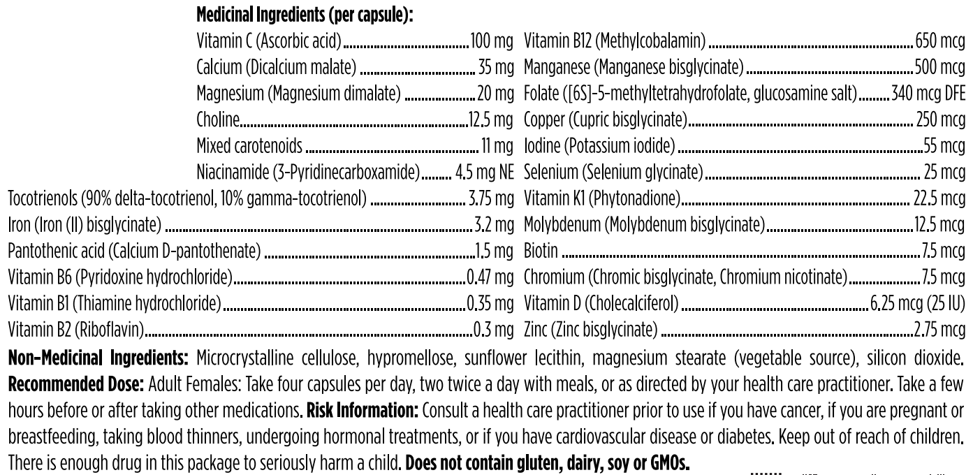 Ingrédients médicinaux (par capsule) :Vitamine C (acide ascorbique) ..............100 mgCalcium (malate de dicalcium)...............35 mgMagnésium (dimalate de magnésium)..................20 mgCholine ................. 12,5 mgMélange de caroténoïdes .................11 mgNiacinamide (3-Pyridinecarboxamide) .................. 4,5 mg NETocotriénols (90 % delta-tocotriénol, 10 % gamma-tocotriénol) ............. 3,75 mgFer (bisglycinate de fer (II))003,2 mgAcide pantothénique (D-pantothénate de calcium)...........1,5 mgVitamine B6 (chlorhydrate de pyridoxine) ..............0.47 mgVitamine B1 (chlorhydrate de thiamine) ...............0.35 mgVitamine B2 (Riboflavine) ................. 0,3 mgVitamine B12 (méthylcobalamine) ................ 650 mcgManganèse (bisglycinate de manganèse) ................... 500 mcgFolate ([6S]-5-méthyltétrahydrofolate, sel de glucosamine).................340 mcg DFECuivre (bisglycinate de cuivre)..............250 mcgIode (iodure de potassium) .............55 mcgSélénium (glycinate de sélénium)............25 mcgVitamine K1 (Phytonadione) .............. 22,5 mcgMolybdène (bisglycinate de molybdène) ................. 12,5 mcgBiotine.............7.5 mcgChrome (bisglycinate de chrome, nicotinate de chrome)...........7.5 mcgVitamine D (cholécalciférol)..............6.25 mcg (25 IU)Zinc (bisglycinate de zinc)............... 2,75 mcg