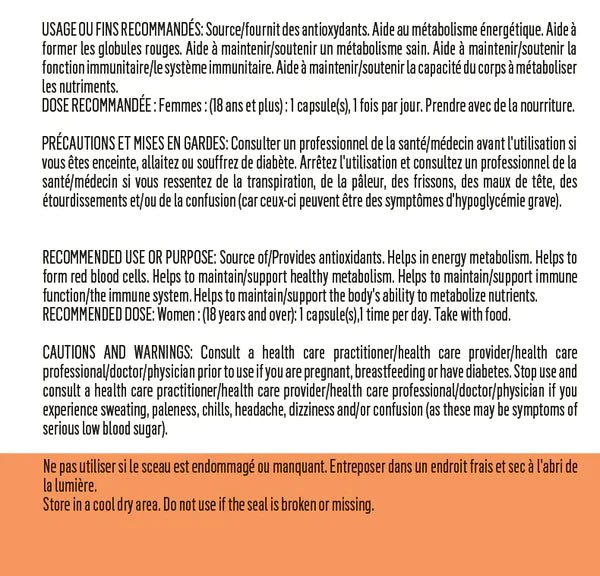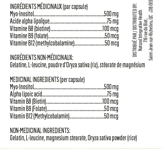 Ingrédients médicinaux : Myo-Inositol 500mg, Alpha Lipoic Acid 75mg, Folate 50mcg, B12 50mcg, Biotin 100mcgIngrédients non médicinaux : Gélatine, l-leucine, poudre d'oryza sativa (riz), stéarate de magnésium