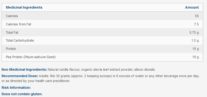 Ingrédients médicinaux (par mesure/15 g) :Protéines de pois (graines de Pisum sativum) .................10 g