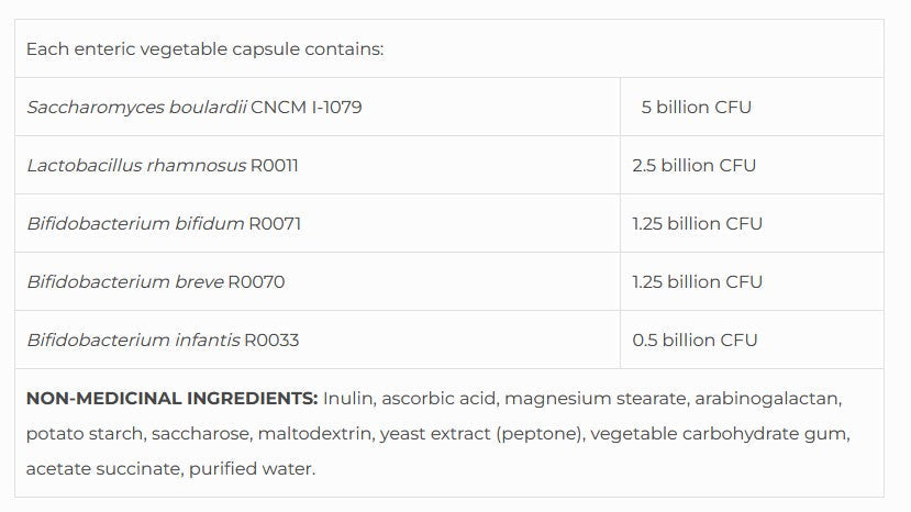 Ingrédients médicinaux (par capsule):Saccharomyces boulardii CNCM I-1079 ...... 5 milliards UFCLactobacillus rhamnosus R0011 ...... 2,5 milliards UFCBifidobacterium bifidum R0071 ...... 1,25 milliard UFCBifidobacterium breve R0070 ...... 1,25 milliard UFCBifidobacterium infantis R0033 ...... 0,5 milliard UFC