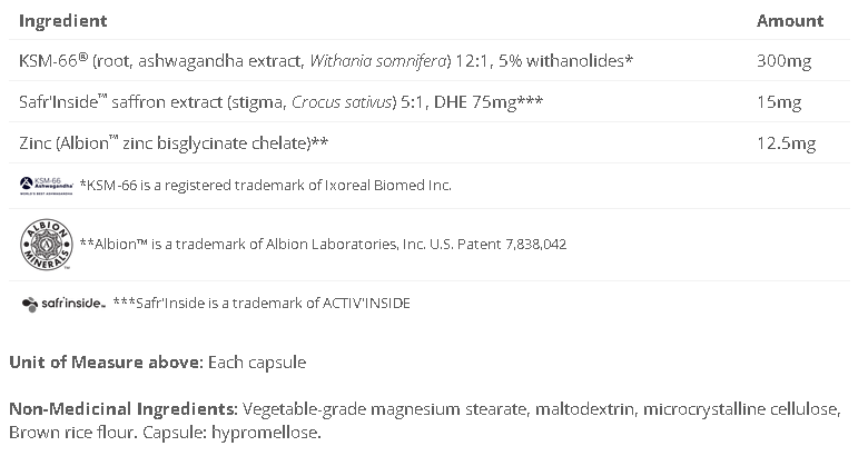 Ingrédient (par capsule):KSM-66® (racine, extrait d'ashwagandha, Withania somnifera) 12:1, 5% withanolides 300mgSafr'Inside™ extrait de safran (stigmate, Crocus sativus) 5:1, DHE 75mg*** 15mgZinc (Albion™ zinc bisglycinate chelate) 12,5 mg