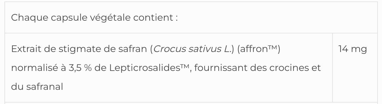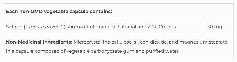 Ingrédients médicinaux (par capsule): Extrait de stigmate de safran (Crocus sativus L.) (affron™), normalisé à 3,5 % de Lepticrosalides™, fournissant crocines et safranal ...... 14 mg