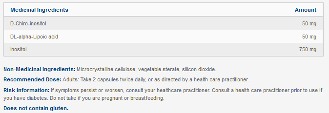Ingrédients médicinaux (par capsule) :D-Chiro-inositol................50mgAcide DL-alpha-Lipoïque ................50 mgInositol.............. 750 mg