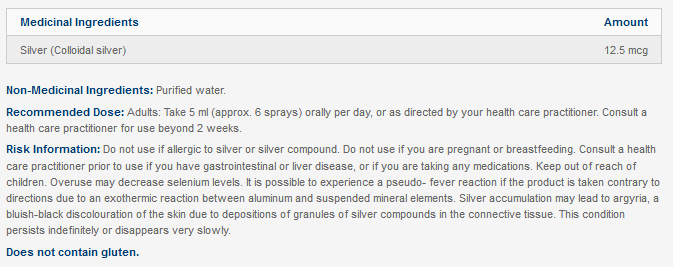 Ingrédients médicinaux (pour 1 spray/0,8 ml) :Argent (hydrolat d'argent)................ 12,5 mcg