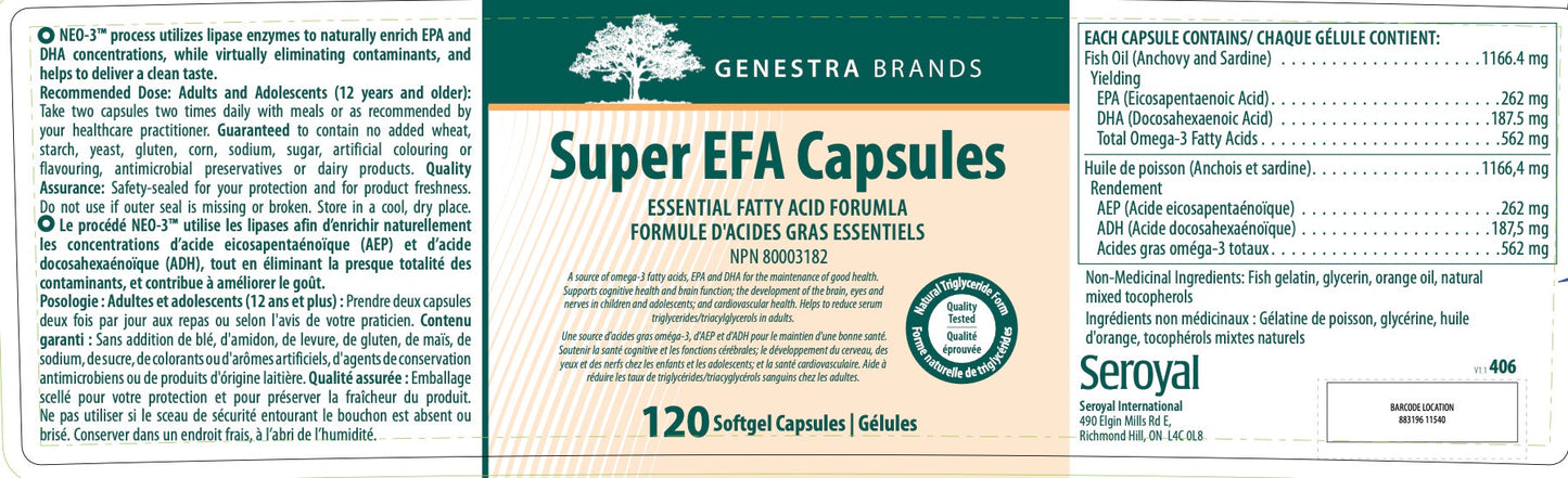 Super EFA Capsules contient un mélange d'huiles de sardines et d'anchois offrant un ratio AEP:DHA de 1,4:1, lequel est idéal pour aider à réduire les taux de triglycérides sériques. Un apport en huile de poisson procurant une dose quotidienne minimum de 100 mg de DHA favorise la santé cognitive et les fonctions cérébrales. Des doses quotidiennes d'AEP +DHA comprenant au moins 150 de DHA contribuent au développement du cerveau, des yeux et des tissus nerveux chez les enfants de 12 ans et plus.
