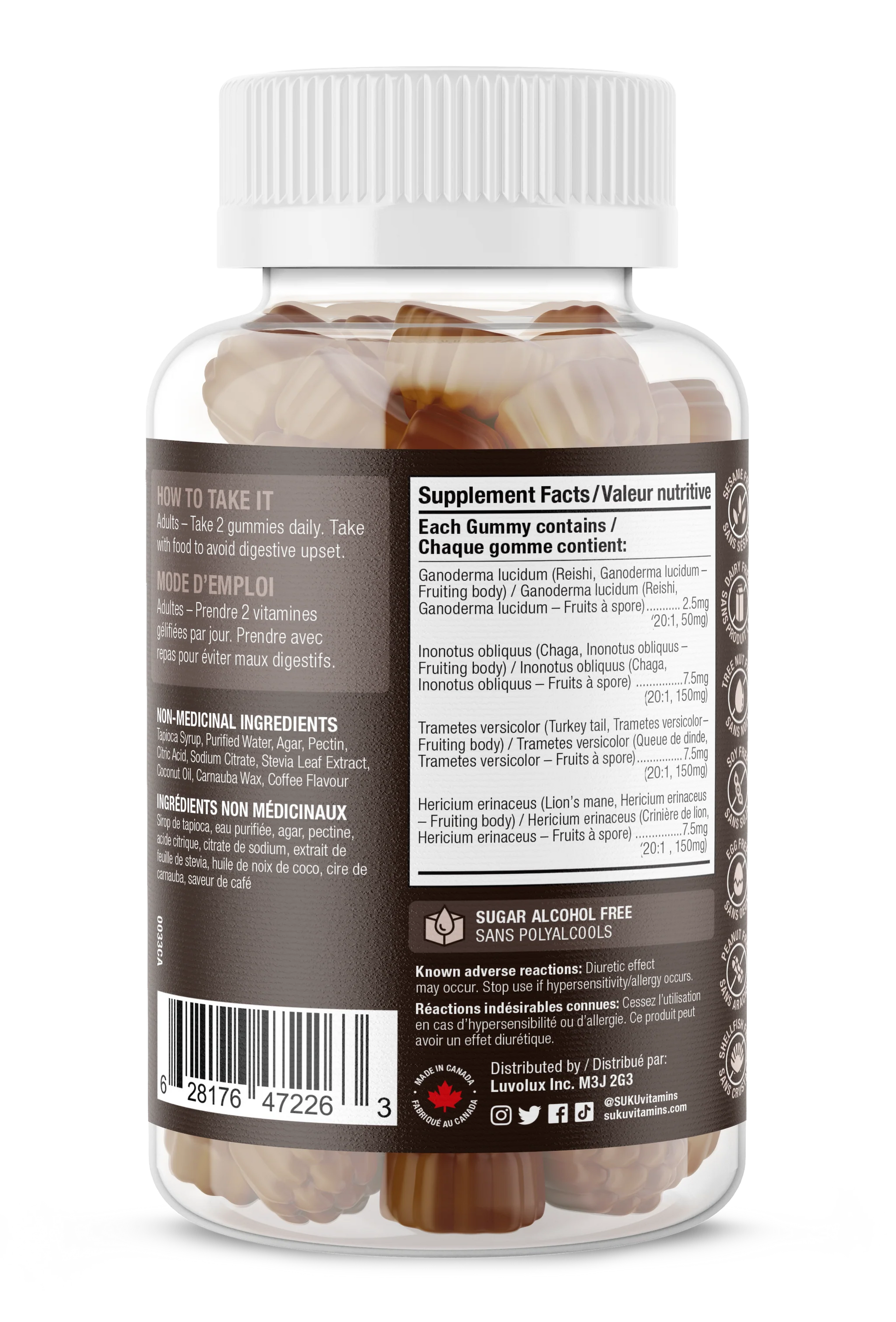 Les champignons sont connus pour leurs propriétés adaptogènes ancestrales, et ces petits gélifiés puissants contiennent quatre types différents de champignons : reishi, chaga, queue de dinde et crinière de lion. Ces gommes sont une source d'antioxydants et de polysaccharides fongiques aux propriétés immunomodulatrices.